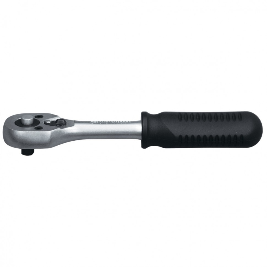 Ключ изготовлен из хромованадиевой стали. Имеет антикоррозионное покрытие из хрома. Храповый механизм с переключателем обеспечивает плавный ход и возможность быстрой смены направления вращения ключа. Присоединительный квадрат с шариковым фиксатором надежно удерживает съемные торцевые головки различных размеров, удлинители, адаптеры. Ключ снабжен механизмом быстрого сброса насадок. Ключ имеет эргономичную ручку с фрикционными ребрами, предотвращающими скольжение. Предназначен для быстрого монтажа резьбовых соединений.